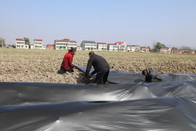 村民覆盖地膜为移栽粉葛幼苗作准备 张瑜 摄