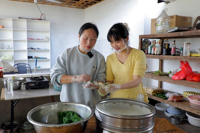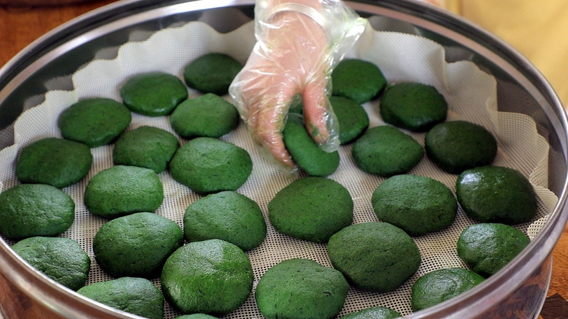 采摘后的青蒿需洗净焯水去涩,切碎后与糯米粉、白糖揉成碧色面团。占艳和项艳红用巧手将面团分剂搓圆,依次码入垫好湿布的蒸笼中。待旺火蒸足一刻钟,青团已化作清香漫溢的桃江春味。