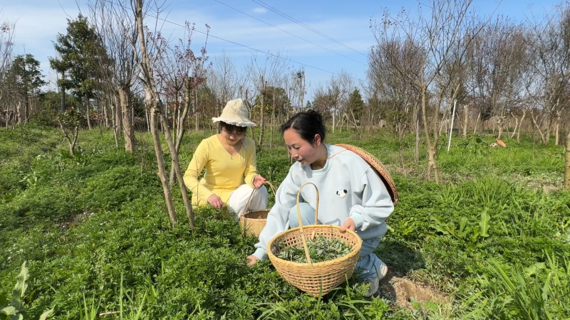 3月19日下午三点,网络达人占艳和项艳红正顶着烈日在石牛江镇八一园林采摘新鲜的蒿草。有着丰富经验的两人轻拢蒿叶,指尖翻飞间,嫩绿的蒿草很快堆满竹篮。