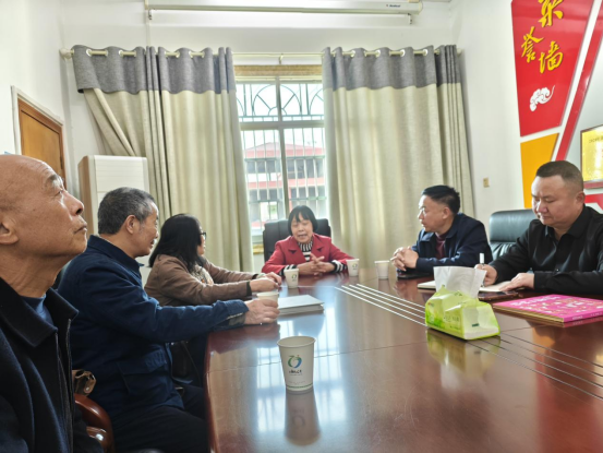 颜新元教授(左二)在县文旅广体局听情况介绍 丁双英 摄