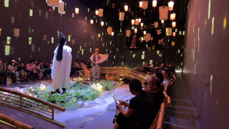 白天场的《竹海幻境》剧场褪去夜色神秘,更显竹林清幽。游客们开启一场穿越千年的“楚地秘境”之旅。作为全国首创的楚辞主题沉浸式体验项目,《桃花江竹海幻境》创新融合山水实景与楚辞文化。通过将“宴、剧、演”有机结合,运用五感联动,为游客打造全方位沉浸式体验。在这里,传统楚辞文化焕发新生,是一次可看、可品、可触的鲜活体验。