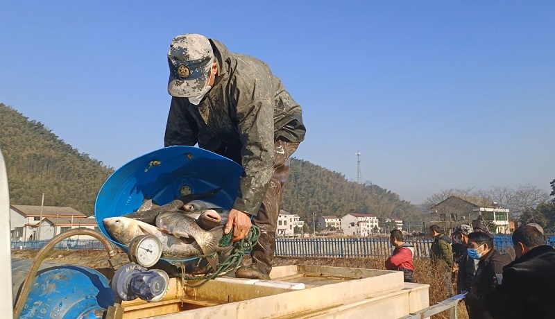改造好的养殖渔场正在收获鲜鱼 罗寒 摄