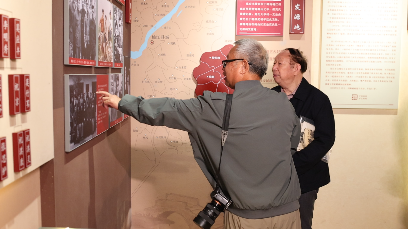 符汇河(右)与李雪冰(左)在莫应丰故居回忆当时照片拍摄的背景 张红莉 摄