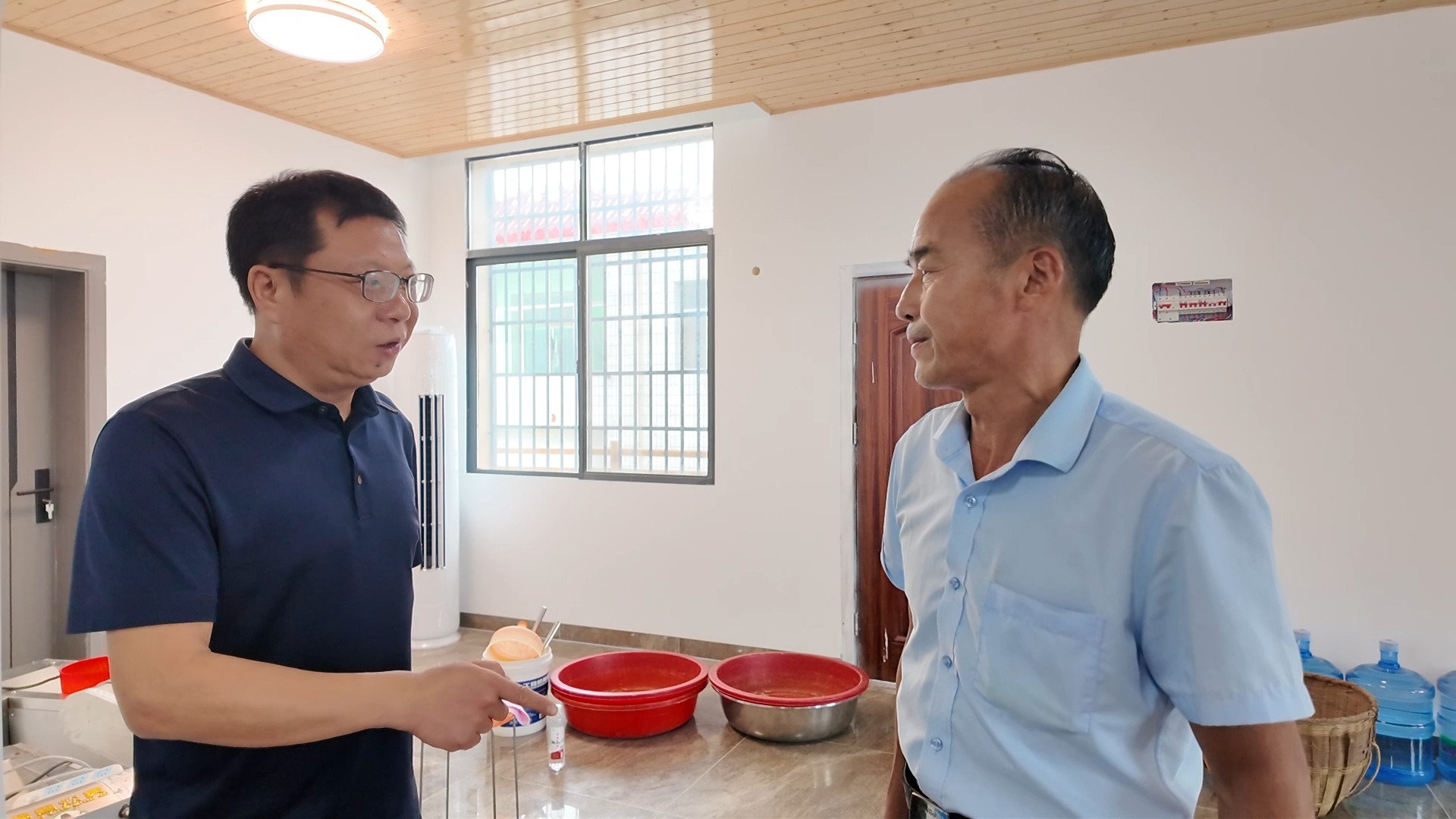 县供销社负责人彭志勇(左)跟雪峰山村经济合作社负责人了解合作社运营情况 刘蓉 摄