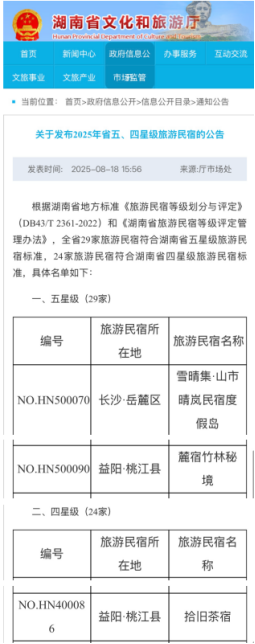 近日,湖南省文化和旅游厅正式发布2025年度省级五星级、四星级旅游民宿评定公告,两家桃江民宿上榜。此次评定严格遵循湖南省《旅游民宿等级划分与评定》标准及管理办法,全省仅有29家获评五星级、24家获评四星级。