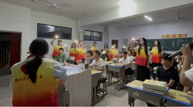 红色音乐会环节,选调生王一龙主持的大合唱成为全场情感的凝聚点。《如愿》《夜空中最亮的星》等歌曲的旋律响起,学生们从轻声跟唱到放声高歌,现场气氛达到高潮,歌声里满是少年们的爱国热忱和青春理想。老师和同学们跟着节奏挥手,沉浸在红色旋律之中。
