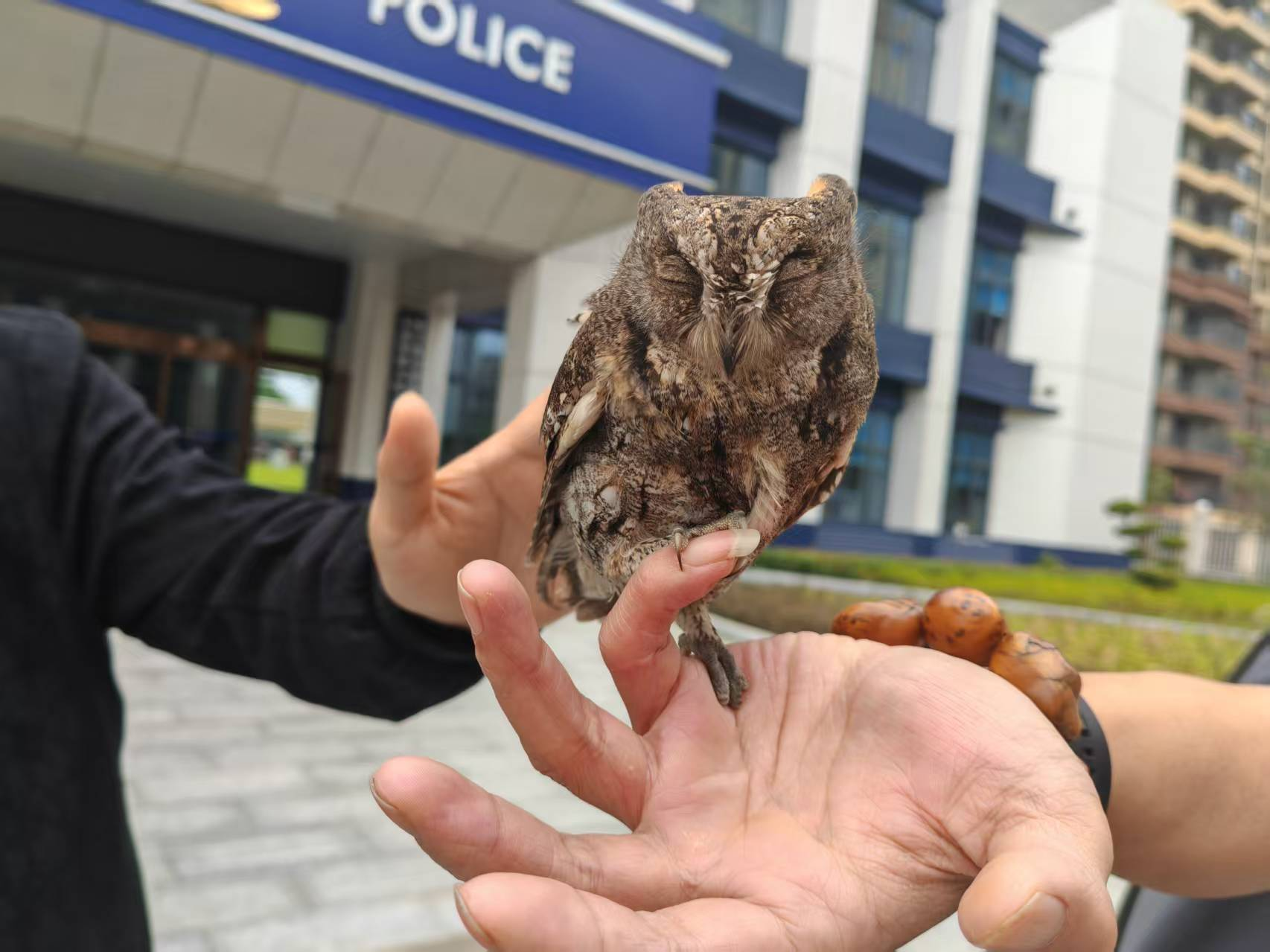 当天上午,灰山港派出所教导员文青松在单位院内灌木丛边发现一只行为异常的小鸟。该鸟呆立原地,不畏人近,引起文青松的警觉。经近距离观察,确认为一只猫头鹰幼鸟。考虑到近期当地气温下降、风雨频繁,为确保其安全,文青松小心翼翼地将幼鸟移至室内临时安置,并为其准备了饮水和食物。随后,他立即联系县林业局,报告情况并请求专业支援。