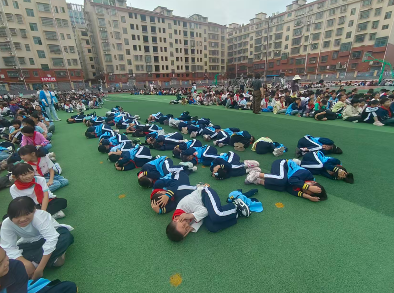 在操场上,为了让师生直观了解逃生,专门安排了一个班的同学为全校师生展示了逃生要点和注意事项。同时,本次演练特别设置了情境模拟环节,让同学们更深刻地了解踩踏事故的危害及正确的自我保护方法,同学们分别体验了正面倒地被踩踏与侧身抱头护颈、身体蜷缩被踩踏的不同感受。日后学生万一在逃生时摔倒,可以利用正确姿势进行自我保护。
