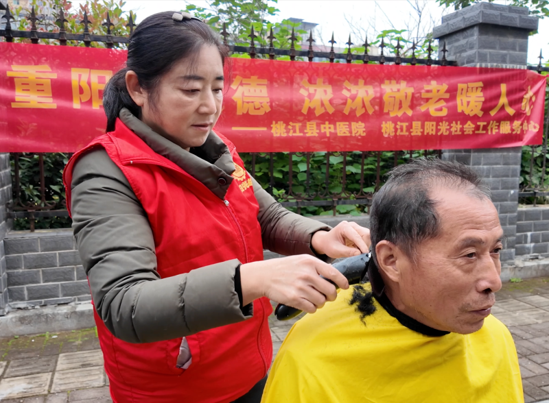 10月29日上午,在重阳佳节之际,20多位桃江县中医医院的医护人员与爱心志愿者走进阳光敬老家园,免费义诊、爱心理发、文艺联欢,为近40位老人暖心服务,送上节日的深情厚礼。