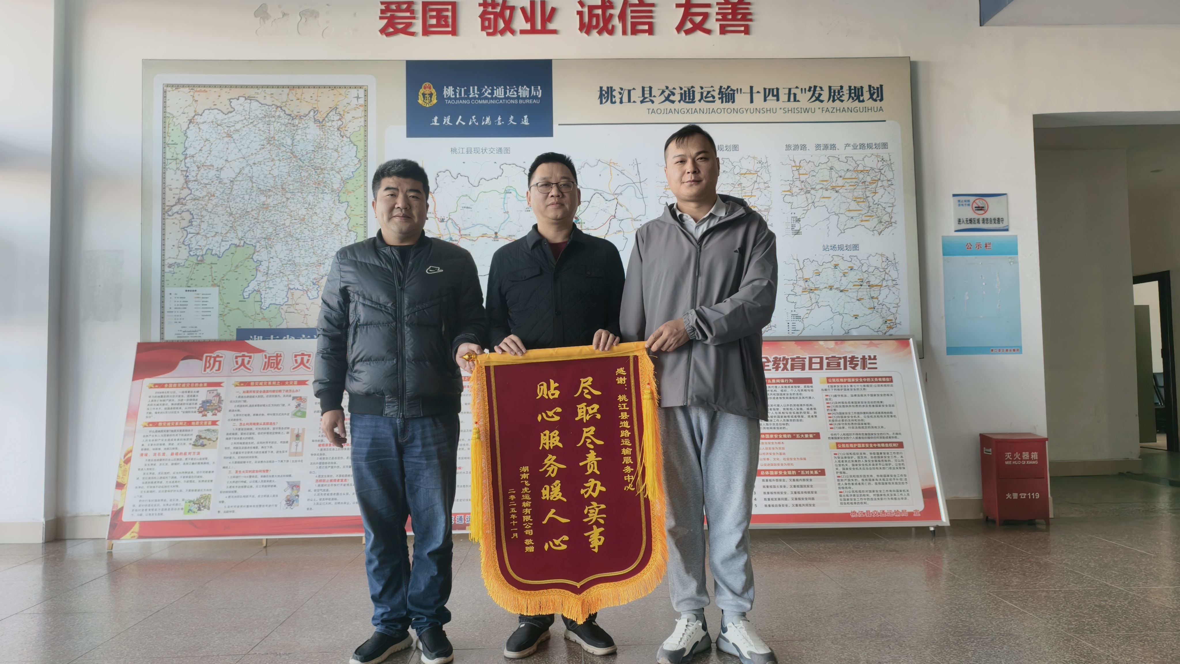 11月21日上午,桃江县飞虎运输有限公司与火山物流有限公司的负责人相约来到桃江县交通运输局,将两面印着“尽职尽责办实事 贴心服务暖人心”的锦旗郑重送到县道路运输服务中心,以感谢县道路运输服务中心一年来为企业发展保驾护航、精准赋能的优质服务。
