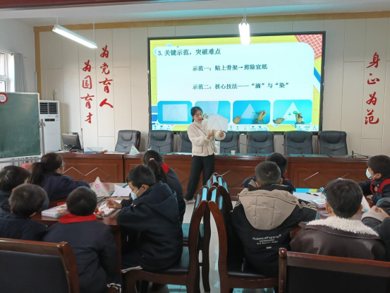 活动现场,城南小学吴笑笑老师带来了劳动实践课《滴染灯笼我来做》。课堂上,吴老师以“非遗小传人”为活动主线,创设趣味实践情境,引导学生循着“观察—探究—实践—评价”的步骤,逐步掌握滴染灯笼“滴、染、晕”的核心技法。她巧妙融入桃江本土竹艺文化元素,让学生在亲手制作灯笼的过程中,既锻炼了动手能力与创新思维,又深切领略到传统手工艺的独特魅力,厚植文化自信与劳动自豪感。