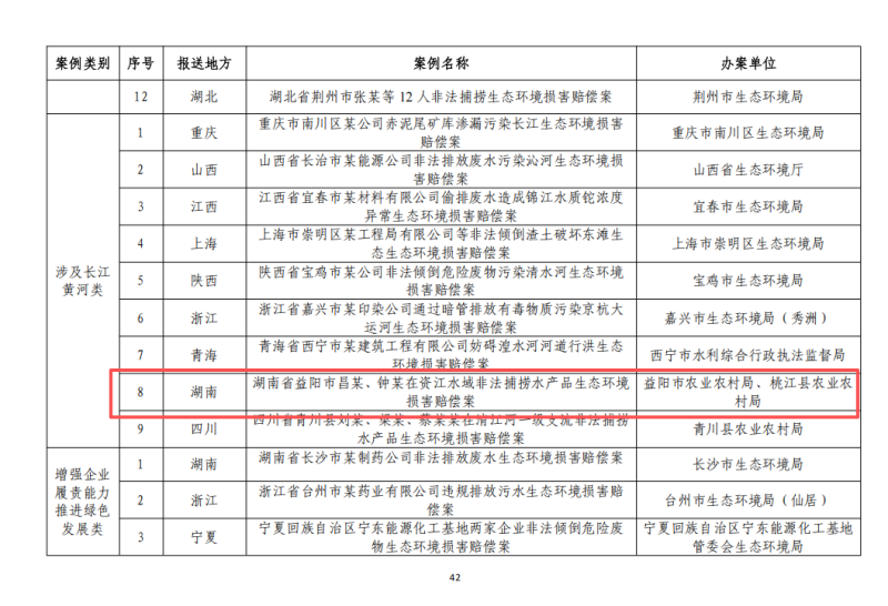 近日,生态环境部联合住房和城乡建设部、水利部、农业农村部共同发布第四批生态环境损害赔偿十大典型案例及参考案例。由益阳市农业农村局和桃江县农业农村局办理的“昌某、钟某在资江水域非法捕捞水产品生态环境损害赔偿案”成功入选全国参考案例。此前,该案已于2024年入选湖南省第二批生态环境损害赔偿十大典型案例。