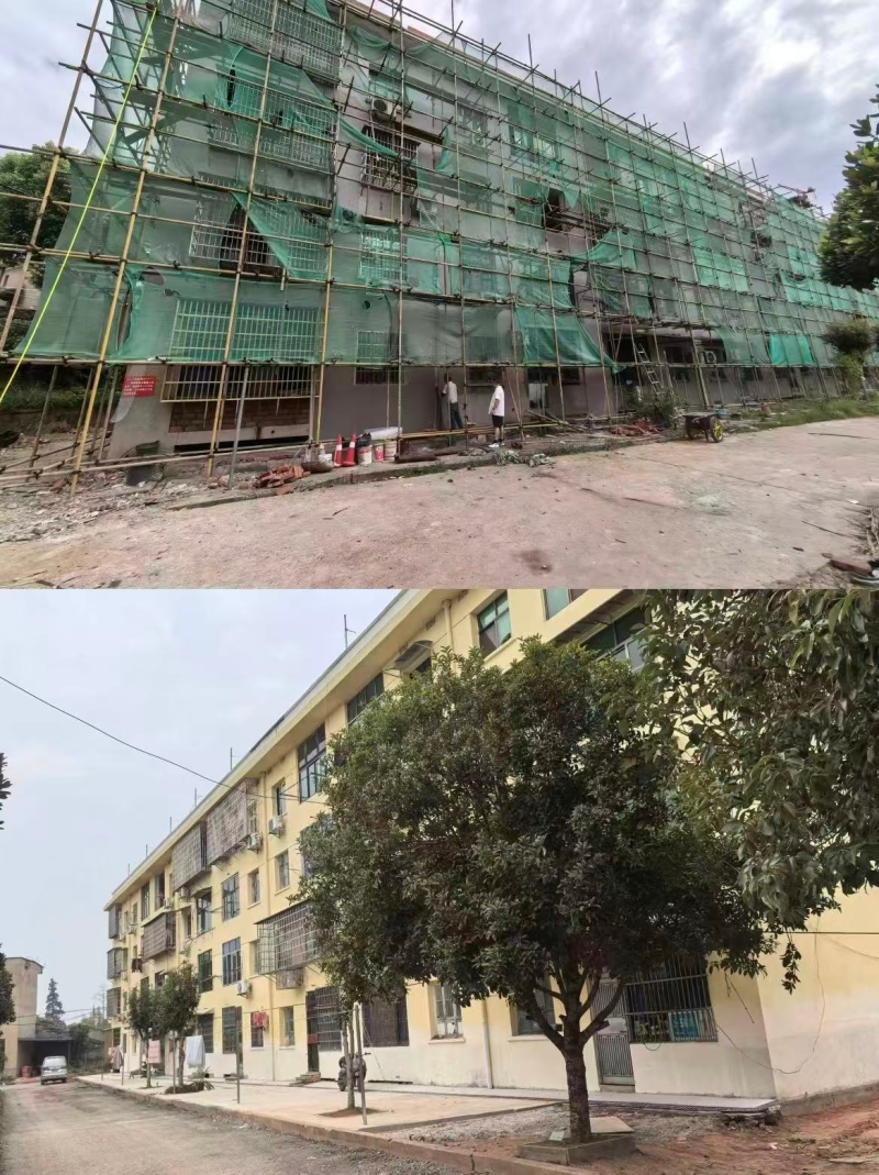 了解到情况后,县住房保障服务中心迅速制定维修加固方案,于2025年6月正式启动对两栋住宅楼进行结构加固、屋顶防水、外墙防渗、道路平整、排水系统升级等全方位改造,至去年12月底全面完工。