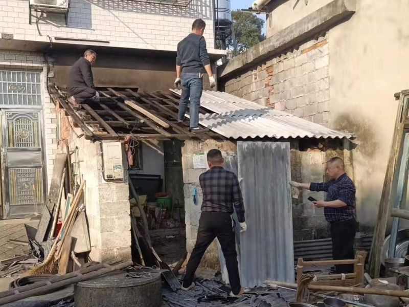 刘友元家的厨房屋顶严重受损,经常漏雨,影响正常生活。在得知该情况后,新桥村两位村干部和老协会长、网格长、辅警一共五人带着爬梯、锤子等工具,上门帮其修缮房屋,更换新瓦片,因维修产生的费用也全部由村上承担支付。