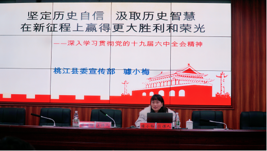 县委宣讲团成员、宣传部意识形态和理论教育组副组长璩小梅从增强历史自觉、明确历史方位、汲取历史经验等五个方面深入解读了十九届六中全会精神。