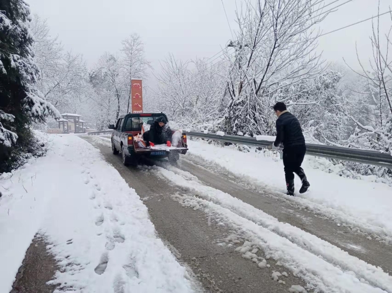 “应急办已抵达猴栗岭,正在清雪除冰。”一大早,镇应急办副主任丁振华便赶到政府,组织应急分队带上装备驱车前往X030县道,对该路段最长最急的一处陡坡进行撒盐除冰,清理被积雪压倒的树枝,并协助过往车辆安全通行。全镇31个村、社区发动党员、妇联执委、志愿者,扛着铁锹、拿着扫把,走上街头巷尾、村组干道,铲除路面积雪,安排人员值守,采取推车、除雪等有效措施,帮助过往抛锚、打滑车辆顺利通行。