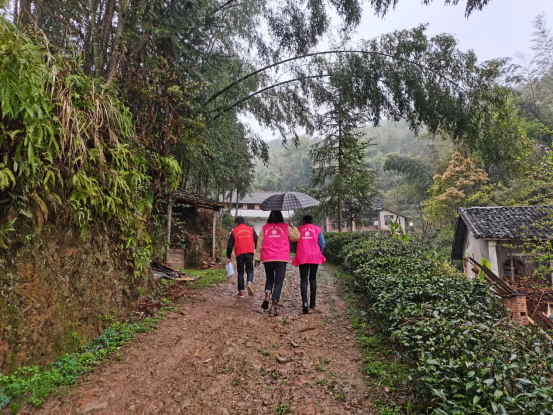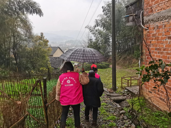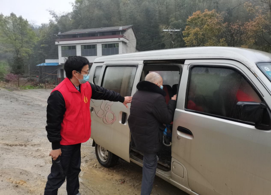 青年志愿者们身穿红马甲前往各村协同防疫工作人员开展“敲门行动”,他耐心地向群众科普疫苗接种相关知识和疫情防控相关要求,助力疫情防疫工作。“下那么大的雨,你们还过来接送我,真的太谢谢你们了。”石井头村刘嗲嗲感激地说。青年志愿者们不顾雨天一身的泥泞和被雨水打湿的衣袖,逐一接送行动不便的老人们至集镇接种加强针,送至卫生院门口后,顾不上片刻的休息的他们又忙着维持现场秩序,引导群众有序排队,保持1米以上的间隔距离,并细心地提醒群众佩戴好口罩。