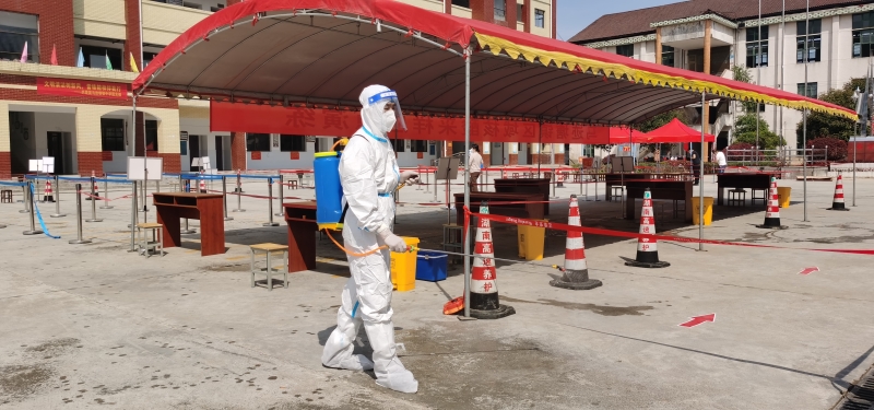 消杀工作人员对采样点场所进行全面消毒