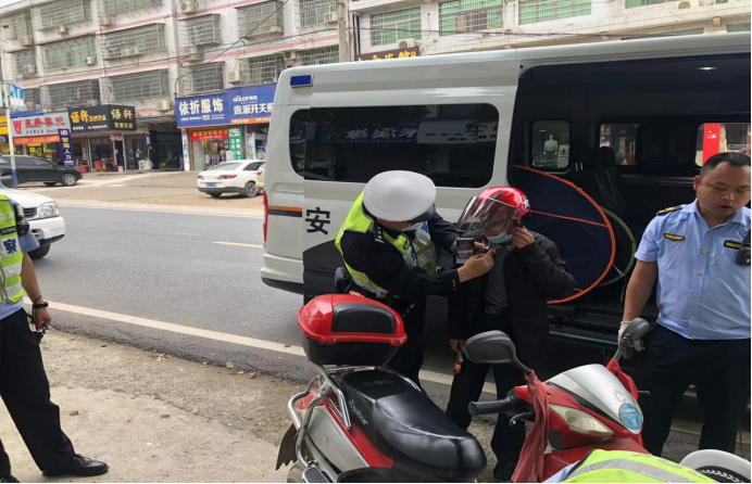执法人员在查处各类交通违法行为的同时,强化宣传引导,面对面向违法当事人讲解电动车、摩托车加装遮阳雨篷、骑乘不戴头盔等行为的危害性,并在辖区内发放交通安全宣传资料近两百份。