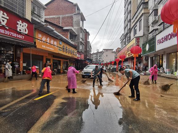 武潭镇区积水最为严重,中心镇区商铺均不同程度受损,洪水褪去,街心满是泥泞,商铺淤泥堆积,无法营业。为减轻汛情对群众和商户带来的影响,武潭镇武潭社区立即组织党员干部和当地群众一起开展灾后应急自救工作,大家积极响应,主动清理淤泥、疏通排水沟,清洗街道,不等不靠投入灾后生产自救。