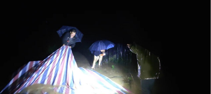 接到报告后,4人迅速开车前往目的地,由于雨势较大,存在山边垮塌现象,车辆行驶至离油渣村山塘路口,已无法继续行进,一行4人大雨中步行20余分钟至油渣村山塘,和守库员经过3个小时的奋战,盖油布、疏通山塘排水孔,成功消除山塘垮塌隐患,确保下游6户人家居住安全。