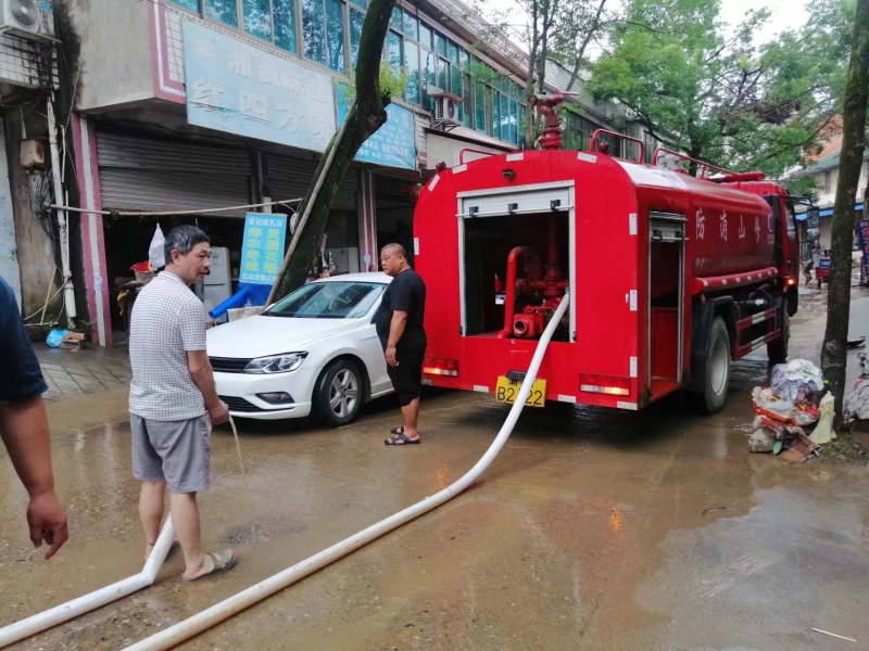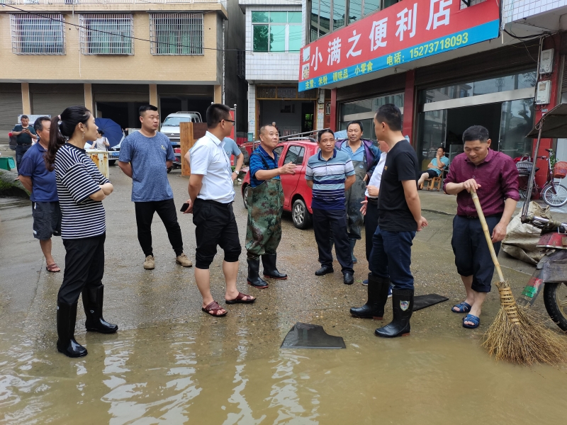 6月3日12时以来,水位逐渐下降,镇党委政府主要领导前往受灾严重的三官桥村指导干群开展生产自救。镇干部与当地群众并肩作战,用水枪冲洗淤泥,抢救转移生产物资。