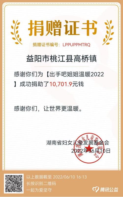 连日来,高桥镇组织镇人大、妇联联合开展“出手吧姐姐 温暖2022—关爱困境妇女儿童”募捐活动,全镇党员干部、爱心人士积极响应、热情参与,仅3天时间114位爱心人士累计募集善款10701.9元。