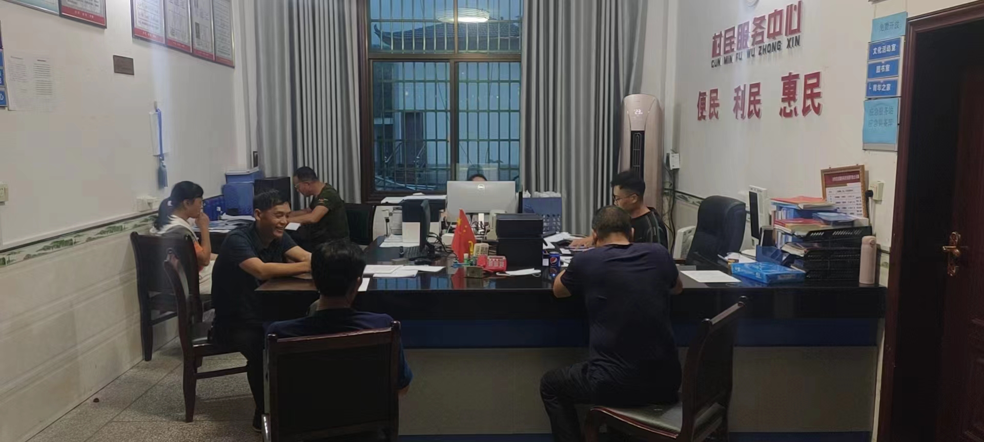 竹山村驻村干部、联村干部、村干部一起加班推进自建房排查与信息录入工作