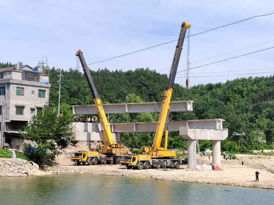 工程刚开始时,修建了通行便道,方便两岸群众出行。但进入汛期后,为保障安全,及时拆除了便道,通行压力陡增。镇党委根据这一现状,多次与施工方对接、商讨、优化施工方案。在确保施工安全、施工质量的前提下,施工方最终决定,从6月26日开始进行梁板转动、吊装、架设,并于6月30日前架设完毕,随即进行桥面、栏杆、搭板的制作和养生。主体工程预计于8月31日提前竣工,力争在9月1日前可以放行所有车辆。