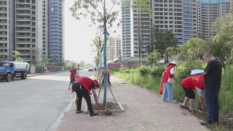 在县城团山社区的桂花园学府公寓,党员志愿者们身穿红马甲,手持扫帚、簸箕、长夹等工具开展卫生清扫,他们头顶烈日,用长夹对随处丢弃的生活垃圾逐一进行清除。