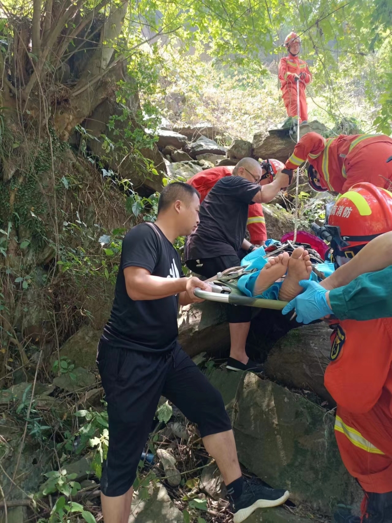 8月1日上午,贺女士与亲友同事在南河冲村鹰嘴岩溯溪时,不慎滑倒从四米余高处跌落至溪谷中,摔伤腰部无法自主活动,同行人员立即拨打电话求救。