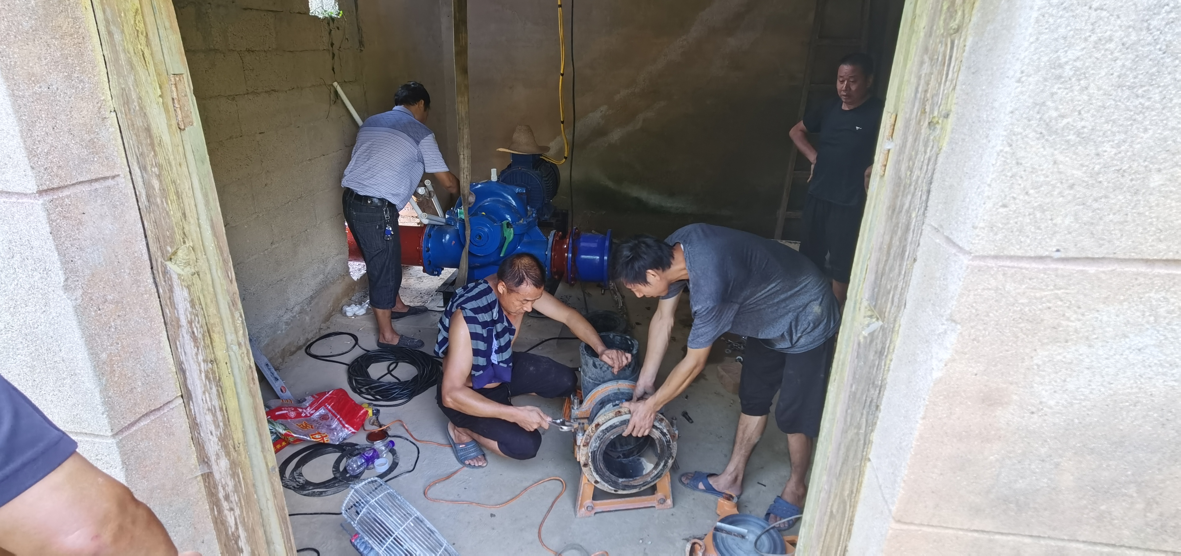 8月12日一大早,三堂街镇乌旗山村村干部周新源与其他几位村民在红旗山电灌机埠内更换一台新的离心泵。该机埠位于资水一侧,建于20世纪70年代。由于连日连续不断的抽水,加上设备老化,先天下午,原有的潜水泵损坏,无法抽水,村干部连夜购买了一台新的水泵进行更换。经过大家连续6个多小时的紧急抢修,下午两时许,中断了一天的机埠又重新可以抽水了。“这次维修就是将原来30千瓦的潜水泵更换成37千瓦的配套离心泵,每小时抽水由原来的38立方米,增加到42.5立方米,将解决我们村上700多亩稻田用水灌溉需要。”周新源介绍。