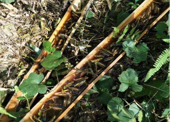 防治物资到位后,镇农业综合服务中心工作人员将杀虫双立即分发到受到竹蝗危害的各个村,并指导村民配置药水,开展蝗虫灭杀工作。在现场,工作人员指导群众在蝗虫出没的竹林布下“陷阱”,将事先准备的药水倒在竹子的剖开处,放到蝗虫密集处,蝗虫“渴了”就会去喝,不到一天的时间就会有大批蝗虫掉落到地上。