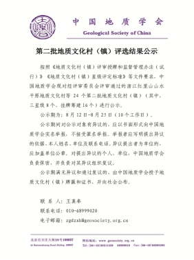 中国地质学会《第二批地质文化村(镇)评选结果公示》