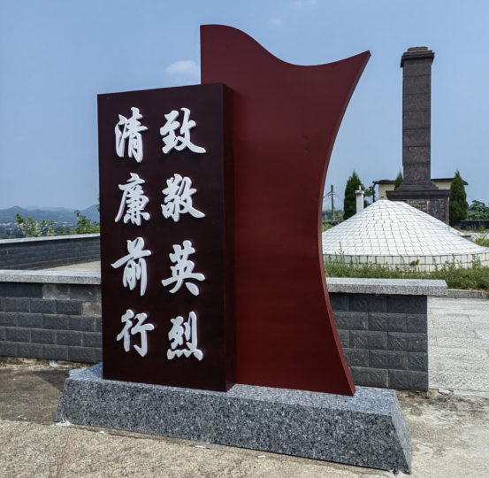 在马迹塘镇三里村伍家仑山丘,沿着一条陡峭的石阶拾级而上,映入眼帘一座写着“致敬英烈,清廉前行”的雕塑,这是近日由桃江县纪委监委出资,在马迹塘战史陈列馆新建立的两座大型廉洁教育宣传雕塑之一,它巍然矗立在烈士纪念园的入口,守护着身后的解放军烈士墓和烈士塔。