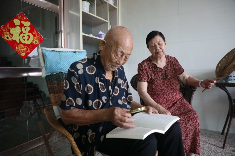詹子纲说:“我今年九十八了,等到了这个社会,享受与经历了这个社会的美好。我喜欢看报纸,一年订三四份报纸,在电视里看新闻,国家的政策都稍许了解一些。”