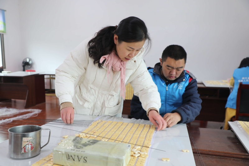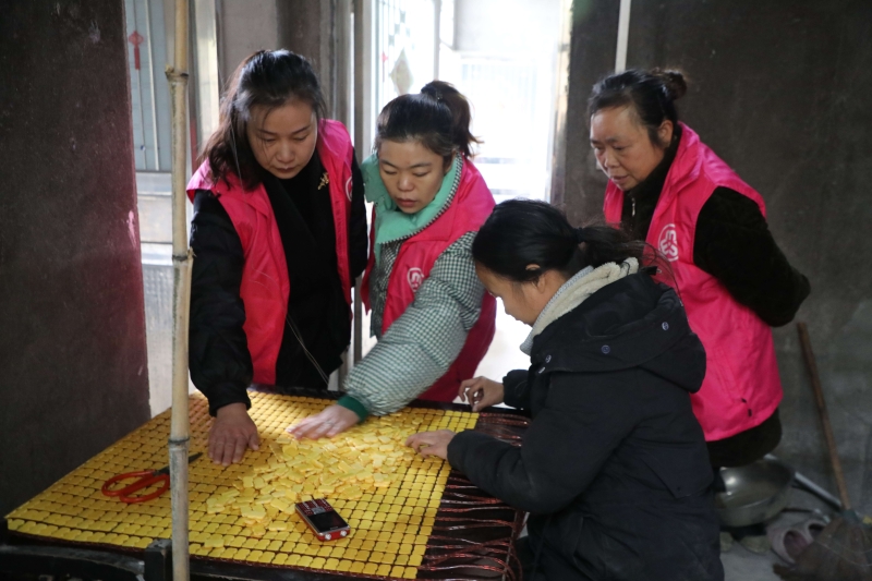 罗叶林同村巾帼志愿服务队人员指导村上肢残智障人员在家创业