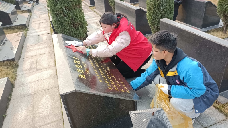 当天上午8点,大家排起队伍在纪念碑前敬献了花篮和鲜花,并向英烈默哀鞠躬。墓园的烈士纪念碑前,在苍松翠柏的掩映下,刻有张子清、夏思痛等英烈们名字的墓碑在阳光的照射下熠熠生辉,这些前辈英烈曾经在战火纷飞的战场上叱咤风云,或者在和平年代里踔厉奋发,勇毅前行,他们的英勇事迹令人肃然起敬。党员志愿者们在桃江烈士纪念碑前一起重温入党誓词,表达新时期的共产党员赓续先辈红色基因,接续奋发创伟业的决心。随后,志愿者们拿起抹布,对有灰尘的墓碑进行擦拭;对墓碑上已褪色的五角星重新进行涂抹;随同来的小志愿者们也积极动手参与其中。