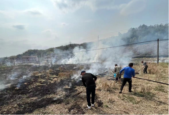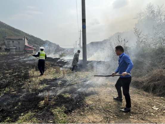当天,在国道干线巡逻过程中,交警中队警员肖金宇发现崇山坪村一户农户田地中正浓烟滚滚,并伴随着一阵烧焦的气味,交警同志和镇干部立即下车,第一时间奔赴现场。经调查发现,原来是田间一处火源正迅速向周边蔓延,火焰即将靠近附近一户居民自建房,而一楼还堆放着大量柴木。气候干燥,火势一旦蔓延后果不堪设想,眼见情况紧急,肖金宇和镇干部立即抄起手边易得的扫把、木棍等简易工具冲向田间,对明火进行扑救,由于担心田间存在复燃风险,工作人员随后使用水桶、水管等工具对冒烟的火堆进行浇水,杜绝复燃风险。