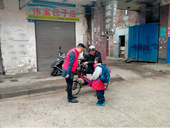 早上7点,正在执勤的党支部书记胡敏,看到一对骑乘电动车的父子,骑车的父亲戴了头盔,而搭乘电动车的孩子没有戴头盔。他连忙上前提醒,告知不戴头盔的安全隐患。这位学生不好意思地说,出门是戴了头盔的,看到要天气晴好就把头藏在了爸爸衣服里,没戴头盔了。父子俩表示,将树牢安全意识,进一步遵守道路交通安全法则。