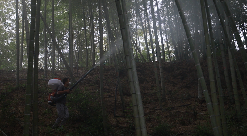 在马迹塘镇大塘坪村笋竹两用林基地,当地村民正使用背负式机动喷雾喷粉机喷洒灭虫粉,对竹林进行全覆盖式作业,这种设备机动性高、作用面积大,是预防竹蝗侵扰的主要防治设备之一,常用于较大面积的农林作物的病虫害防治工作。