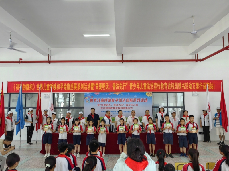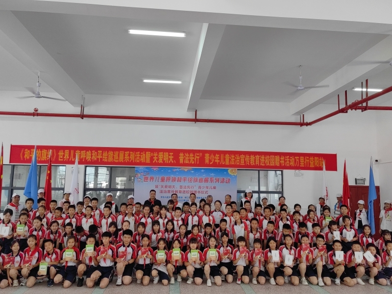 6月12日,中华儿童文化艺术促进会到桃江县开展世界儿童呼唤和平绘旗巡展系列活动暨“关爱明天、普法先行”青少年儿童法治宣传教育进校园赠书活动。