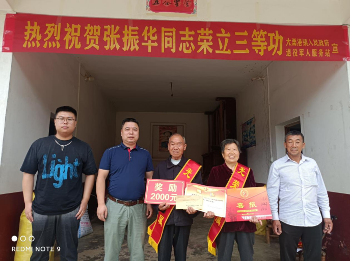 6月15日,大栗港镇退役军人服务站工作人员为荣立三等功的现役军人张振华家属送去立功喜报及慰问金。