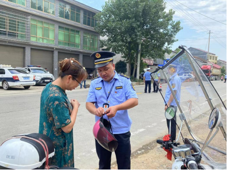 执法人员教摩托车驾驶员正确配戴安全头盔 龚姣 摄