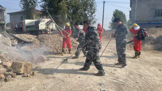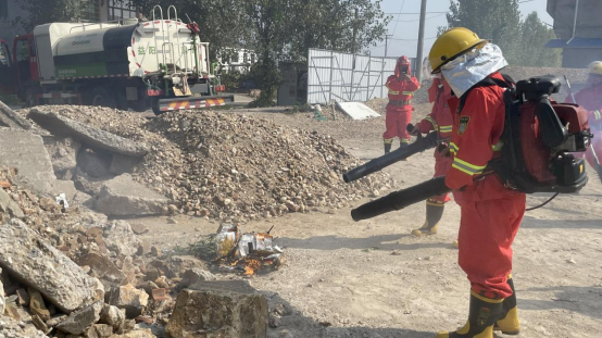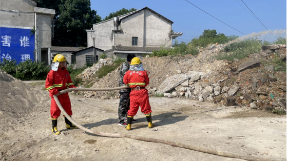 本次演练模拟了高桥一林场发生山火,火势较大且有蔓延趋势。在接到火情报警后,演练人员在三分钟内集合完毕,五分钟到达火灾现场,应急救援队队员运用消防车喷水、背负式风力灭火机、灭火拖把等工具,成功将火扑灭;民兵、村委干部做好安全撤离、余火清理、现场留守等后续工作。