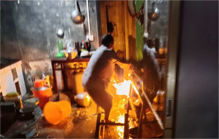 当天晚上7点15分,80多岁的彭嗲刚刚做完晚饭,却忘记关火。随着锅内水分逐渐蒸发,铁锅被烧穿引起火灾,随后火焰开始蔓延至周边的可燃物,并逐步向煤气罐靠拢,一旦煤气罐引燃,很有可能发生爆炸,情况十分危急。