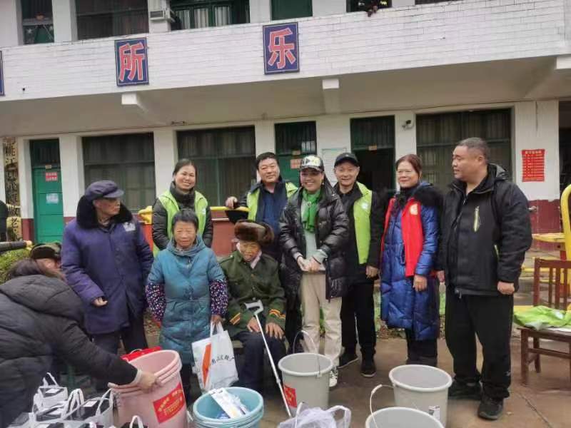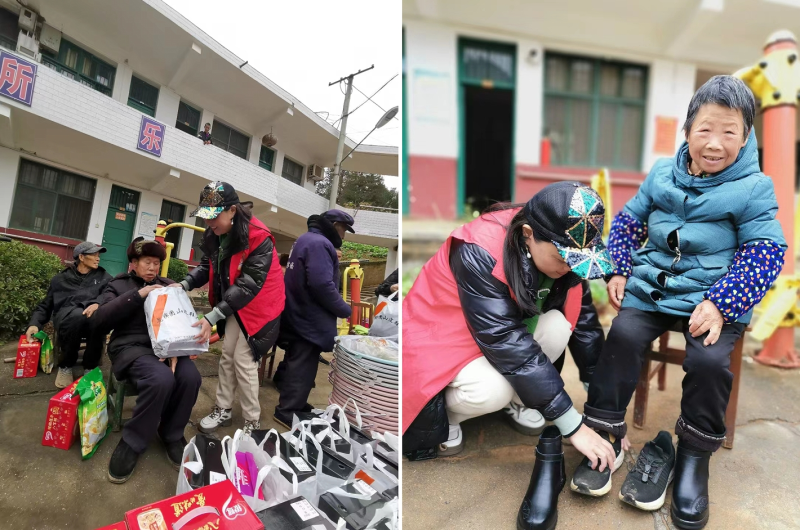 志愿者为老人们带来了牛奶麦片等食品,赠送了桶子、毛巾、牙膏等日常用品。桃江团山皮鞋厂负责人刘海娥母子给每位老人赠送了一双定制毛皮鞋和鞋垫、袜子、鞋油等用品。