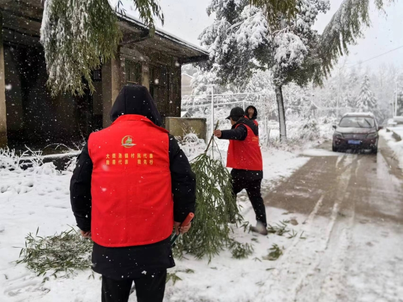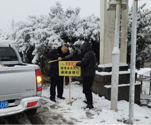 为做好雨雪冰冻天气保安保畅工作,镇党委政府充分调动“三长制”志愿服务力量,提前部署,充分利用三级网络群,发出雨雪冰冻灾害预警,各级“三长制”联络群立即逐级部署,各位邻长志愿者纷纷响应,自发准备工具,20日下午起,便枕戈待旦以迎大雪。22日清晨,以风雪为号,全镇170余名邻长志愿者以村为单位迅速集结,携着扫雪除障工具,穿上如腊梅般鲜红的志愿者马甲,迎着风雪出发。各村邻长志愿者沿着G536国道及各村主要干道,清除路面积雪、砍除道路两旁遮挡视线的树枝、设置警示标牌等,全力保障群众出行安全。