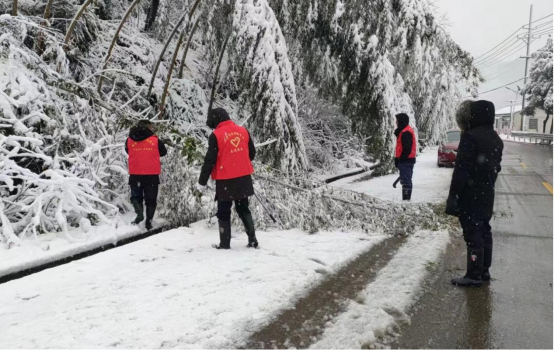 活动中,志愿者们提前在交通路口设置提示牌,连夜对积雪路面抛洒工业盐进行融雪,一清早对倒伏在路面的楠竹与树木进行清理,同时出动铲车对积雪路段进行积雪铲除,在有冰雪覆盖的路面也可以看到身穿红马甲的志愿者们使用各种除雪工具进行铲雪。大家积极配合、通力合作,将汗水挥洒在冰天雪地中,全力保障人民群众出行安全。