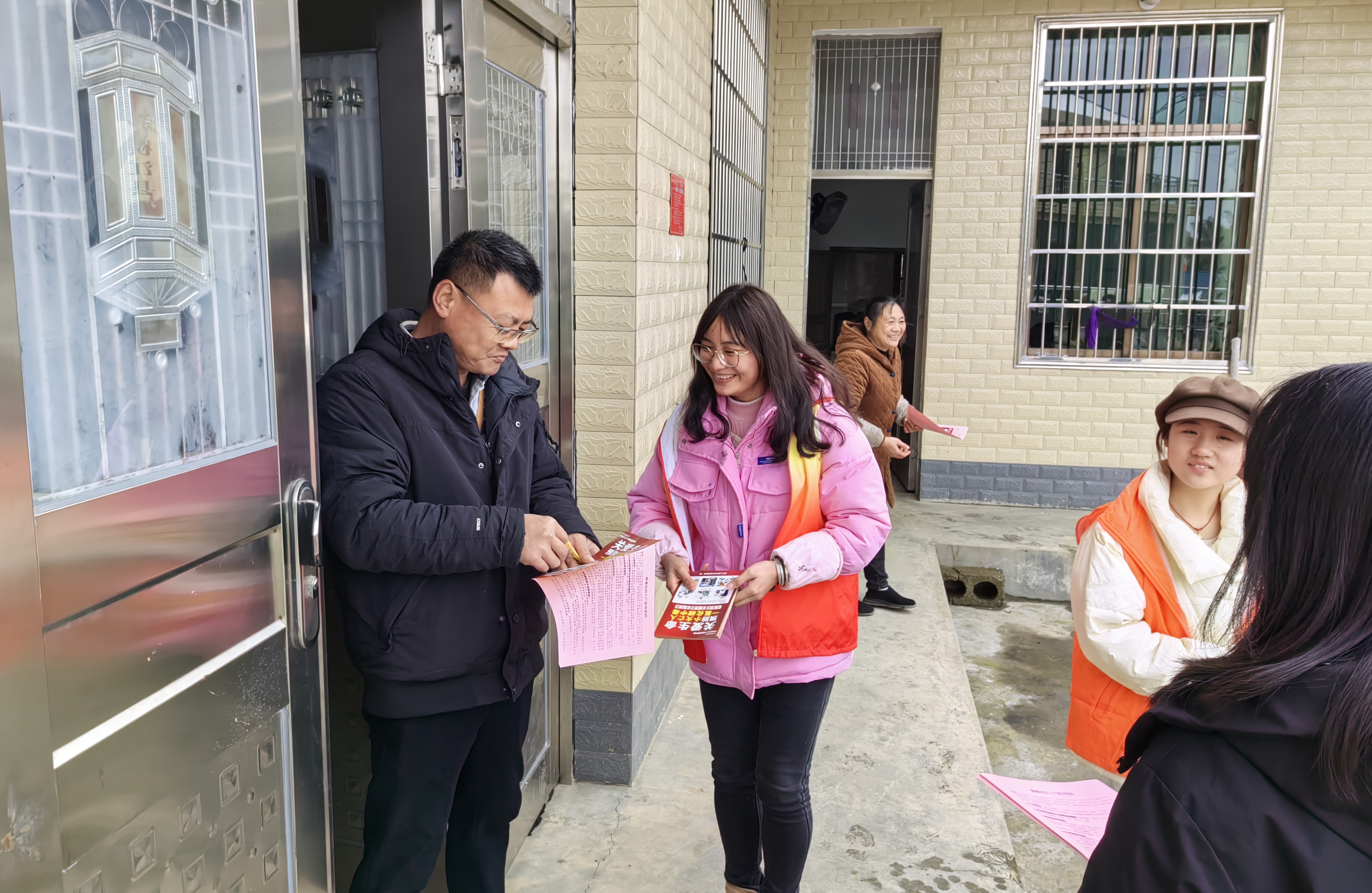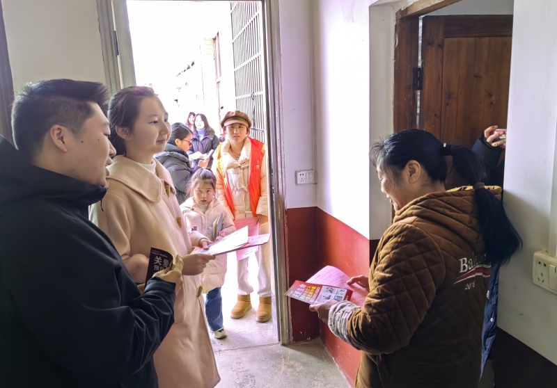课后,大学生志愿者们走村入户向群众发放宣传资料,耐心细致地讲解法律知识,为群众答疑解惑。